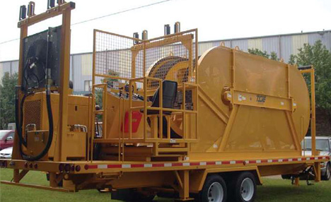 The T150-4H/4 is capable of tensioning 1,2,3 or 4 conductors with infinite variable tensioning control. The bullwheels are independently controlled with the ability to be coupled to increase tension capability. The machine is also capable of full pull-back at reduced linespeed.The trailer is equipped with high flotation tires suitable for pulling the unit through sand or swamp land conditions. The frame is fitted with a single point lift to allow lifting with a crane..