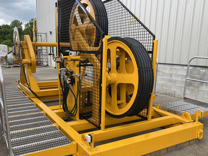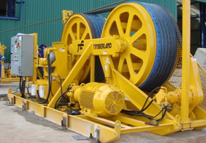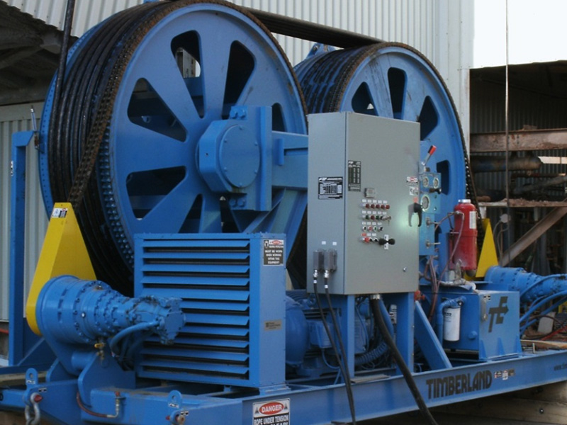 Timberland is a world leader in the design of twin bullwheel type tensioners and reelwinders used for the handling and installation of mine hoist ropes. The system is used to tension ropes that are being installed on to a hoist, or to wind in ropes that are being removed from the hoist.
